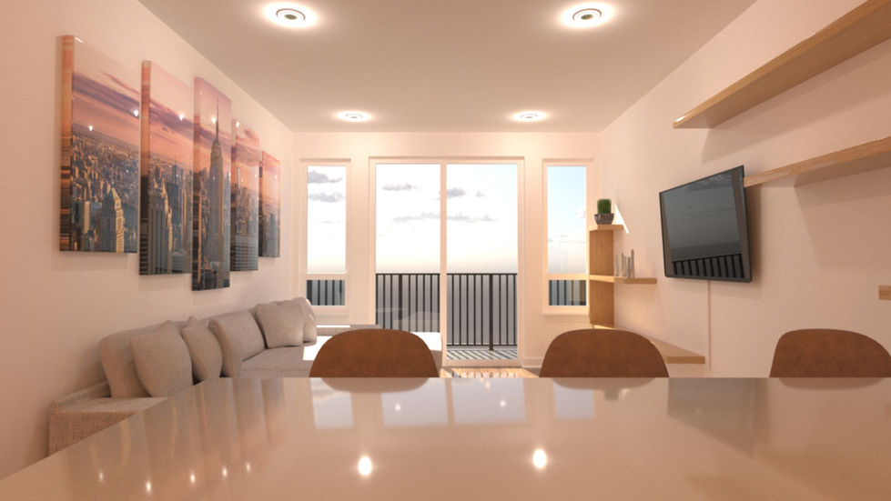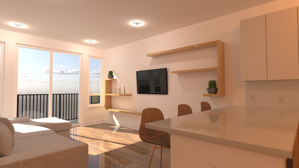 This project features modern living rooms and kitchens with minimalist wooden shelves, sleek furniture, and large windows. The designs create a contemporary and comfortable living environment with a focus on functionality and style.