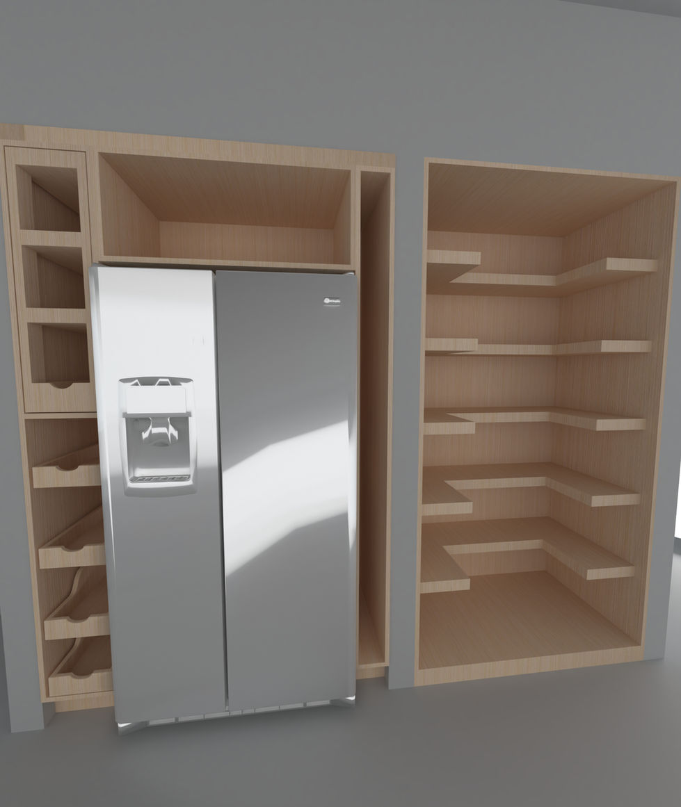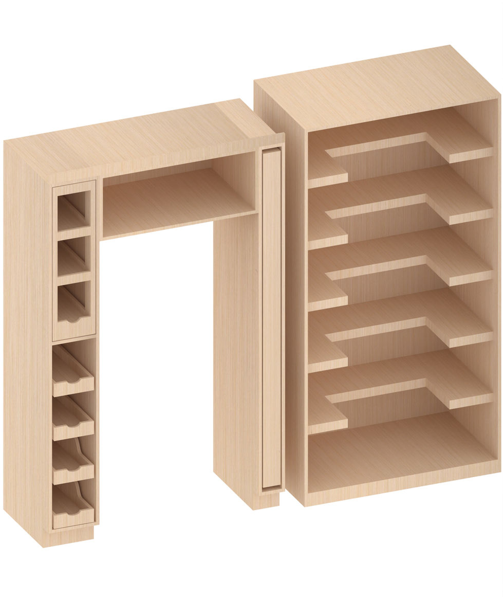 This project features wooden retail displays with pull-out drawers, multiple compartments, and built-in refrigerator space. The designs showcase the versatility and functionality of wooden fixtures in retail environments.
